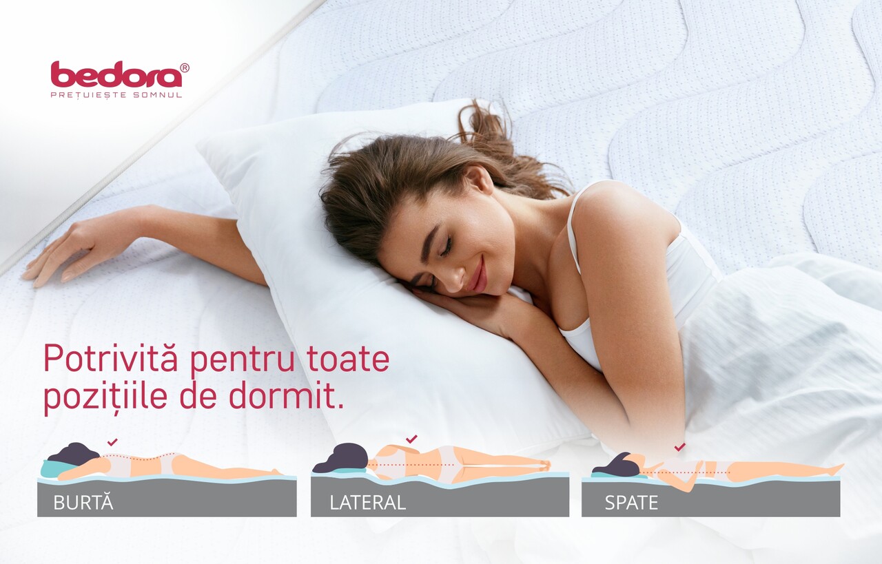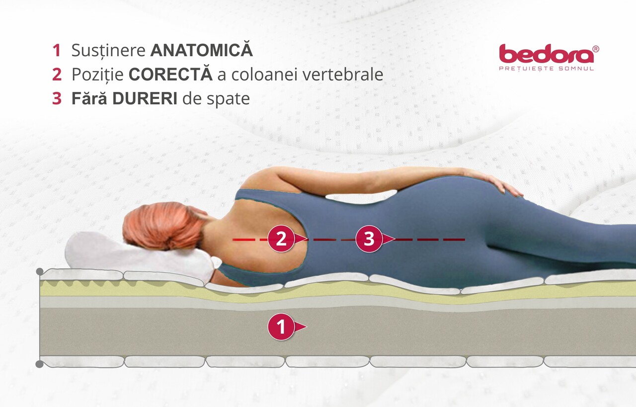 Baza saltelei din spuma elastica cu celulatie deschisa asigura o sustinere anatomica a corpului si o pozitie corecta a coloanei, fara dureri de spate in timpul somnului. Confortul saltelei este asigurat de un strat generos din spuma Memory Foam 7 zone 3 cm. Acest strat de confort reactioneaza la caldura corpului si se muleaza pe acesta eliminand punctele de presiune in timpul somnului pentru a relaxa muschii si a asigura o circulatie a sangelui corespunzatoare.