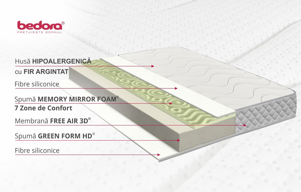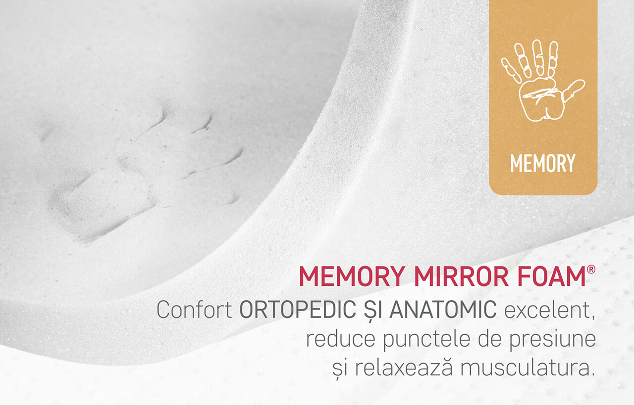 O saltea ce combina calitatile ortopedice ale spumei elastice Green Form HD® cu confortul spumei Mirror Foam® Memory de 3 cm.