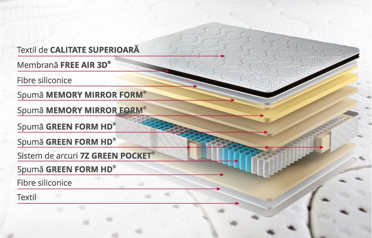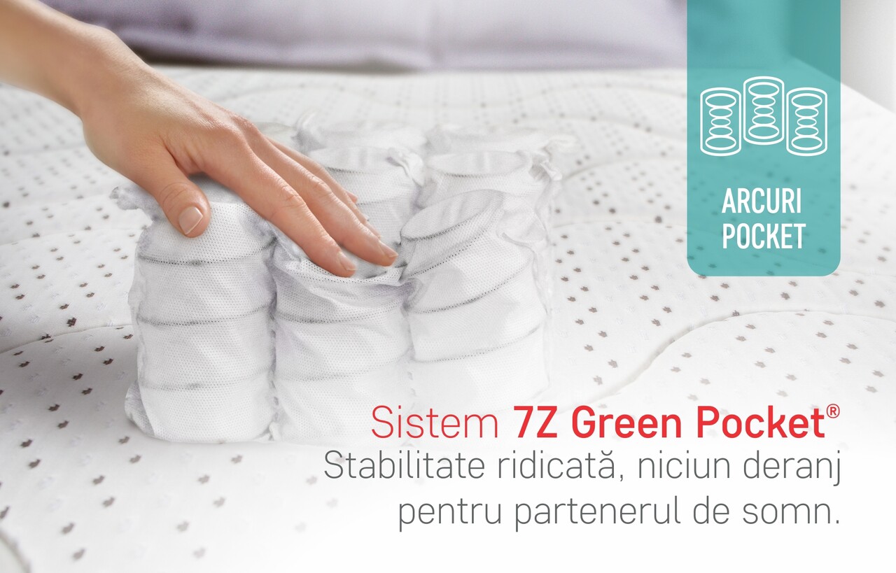 Tehnologia avansata a sistemului de Arcuri 7Z Green Pocket® impreuna cu cea a stratului de Green Therm Memory® asigura un somn fara propagarea miscarilor partenerului.