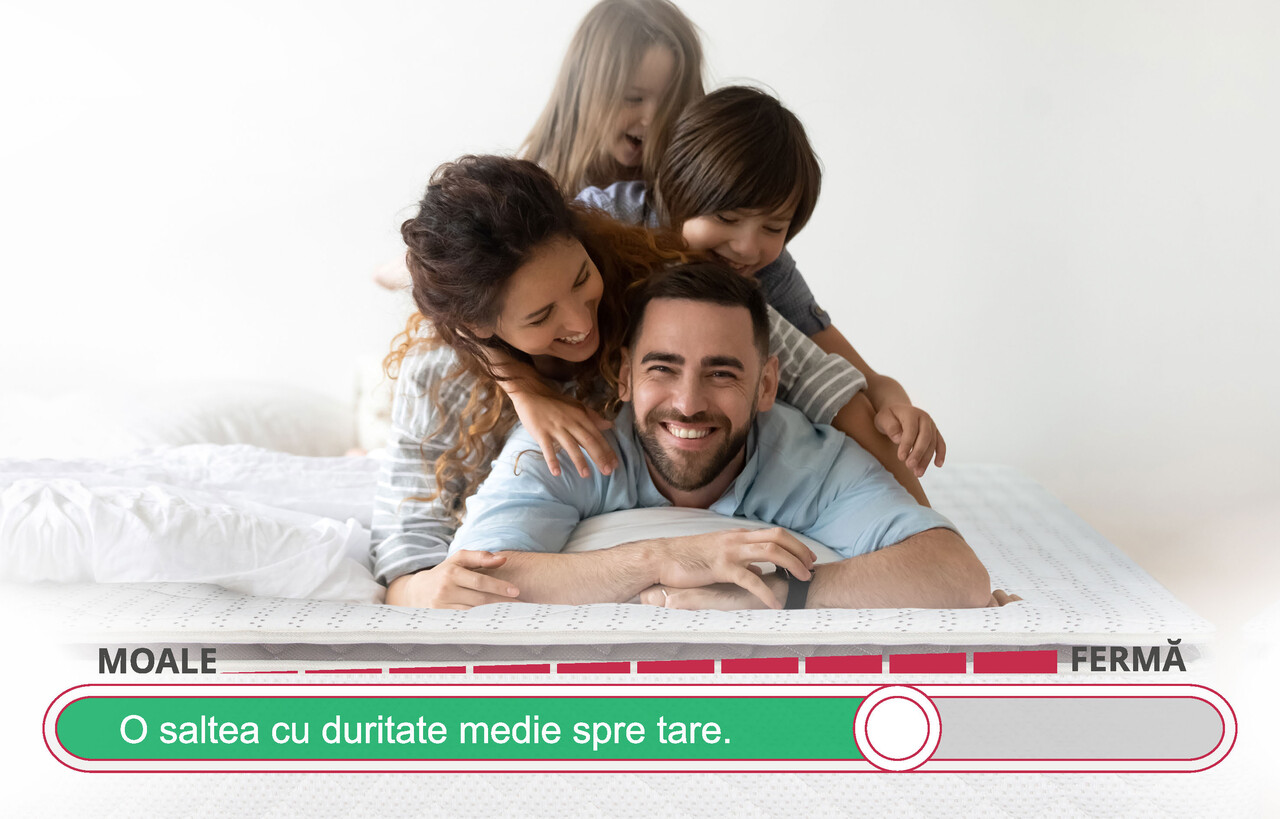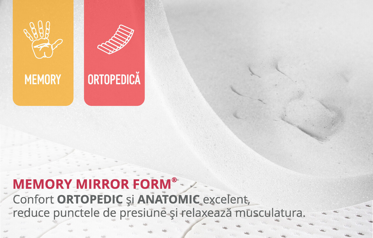 Topperul atasat saltelei constituie stratul de confort si este format din spuma elastica Green Form HD® cu celulatie deschisa si 3 cm spuma Green Therm Memory® care se muleaza pe corp eliminand punctele de presiune in timpul somnului pentru a relaxa muschii si a asigura o circulatie sangvina sanatoasa.