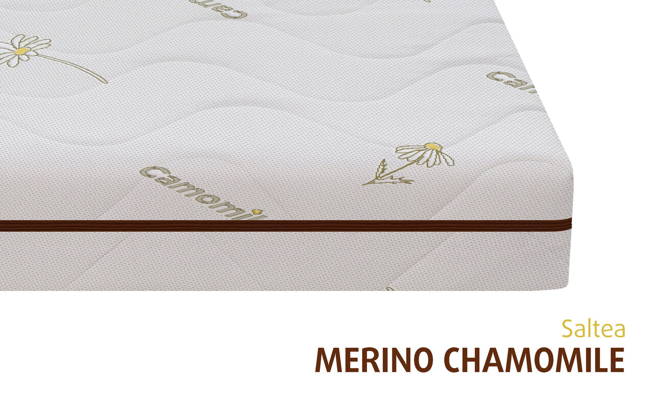 Salteaua Merino Chamomile este realizata cu husa din tesatura moale la atingere, matlasata pe partea superioara cu un strat generos de mix lana cu vatelina o combinație ideala de confort, durabilitate și protecție naturală pentru un confort sporit, iar parte inferioara cu fibre naturale de bumbac certificata OEKO-TEX care imbunatateste aerisirea in timpul somnului.
